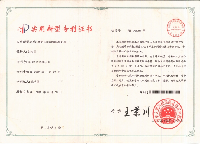 實(shí)用新型專(zhuān)利證書(shū)